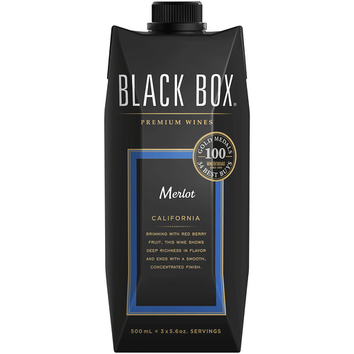 Black Box Merlot is a smooth, well-balanced red wine that comes in a sleek and transportable box. Made from grapes harvested in world-class appellations, this wine has plum, vanilla, and cinnamon aromas that lead to flavors of black cherry and red berries. The finish is soft with supple acidity. It makes the perfect pairing with pork roast and tomato sauces. Black Box Merlot is the perfect choice for outdoor and on-the-go occasions, from hanging by the pool to camping with friends. Each 500 mL box contains about 3 glasses of wine. The convenient, compact box is shatterproof and resealable, making any outing easy. Black Box is the most awarded boxed wine. In addition to Merlot, Black Box also offers Cabernet Sauvignon, Pinot Noir, and other varieties.