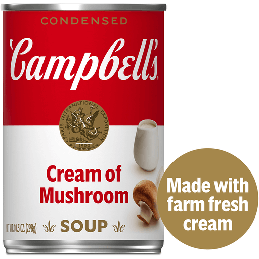 Campbell’s® Cream of Mushroom Soup is made with no preservatives, tender mushrooms, and farm-fresh cream, for a creamy, rich flavor. America's favorite soup, Campbell's Condensed Soup has over 125 years of excellence, and is the start to a great recipe. A versatile secret weapon in the kitchen, Campbell's Cream of Mushroom Soup is perfect for holiday recipes, green bean casseroles, and sauces.