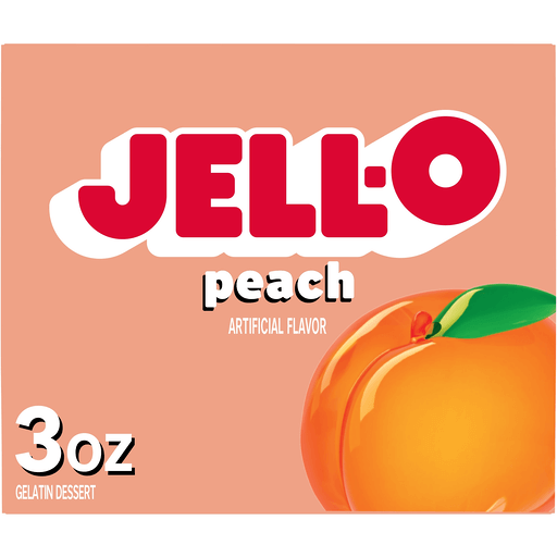 Snack happy. Jell-O Peach Artificially Flavored Gelatin Dessert Mix lets you add some wonder to your day with a delicious snack. Spoon up a smile with our artificially flavored peach Jell-O gelatin that contains 90 calories per serving. Our colorful, jiggly treat is perfect for everyday snacking or special occasions with family and friends. Additionally, our gelatin dessert mix is a versatile ingredient for creating desserts like poke cakes, parfaits, pretzel salads, rainbow layer cakes and more. Our artificially flavored peach gelatin dessert is easy to prepare. Simply add 1 cup boiling water to the gelatin mix, stir for 2 minutes until completely dissolved, stir in 1 cup cold water, then refrigerate for 4 hours or until firm. Each Jell-O gelatin dessert mix is individually packaged in a 3-ounce sealed pouch and makes 4, 1/2-cup servings.