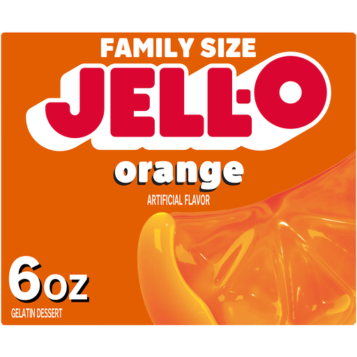 Snack happy. Jell-O Orange Artificially Flavored Gelatin Dessert Mix lets you add some wonder to your day with a delicious snack. Spoon up a smile with our artificially flavored orange Jell-O gelatin that contains 90 calories per serving. Our colorful, jiggly treat is perfect for everyday snacking or special occasions with family and friends. Additionally, our gelatin dessert mix is a versatile ingredient for creating delicious desserts like poke cakes, parfaits, pretzel salads, rainbow layer cakes and more. Our artificially flavored orange gelatin dessert is easy to prepare. Simply add 2 cups boiling water to the gelatin mix, stir for 2 minutes until completely dissolved, stir in 2 cups cold water, then refrigerate for 4 hours or until firm. Each family size Jell-O gelatin dessert mix is individually packaged in a 6-ounce sealed pouch and makes 8, 1/2-cup servings.
