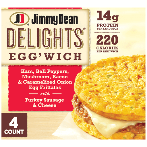 Jimmy Dean Delights Egg’wich Breakfast Sandwiches With Ham, Bell Peppers, Mushroom, Bacon, and Onion Egg Frittatas With Turkey Sausage and Cheese, Breadless, Frozen 4 Ct