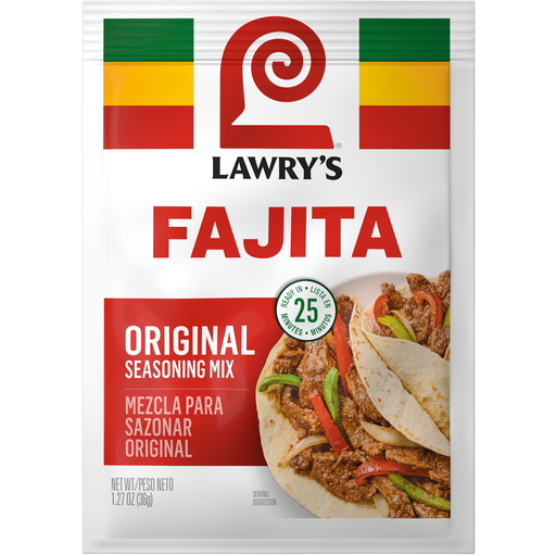 Take your taste buds on a trip to the Southwest with Lawry's Fajitas Seasoning Mix. Featuring a spicy blend of natural flavors, including black pepper, chili pepper, oregano, cumin, garlic and a hint of lime, this seasoning mix is all you need to prepare sizzling restaurant-style fajitas in no time. Simply combine seasoning mix with steak, chicken or ground turkey and sauteed veggies, spoon into tortillas and add your choice of toppings. Or try seasoning mix in a fajita layered dip.