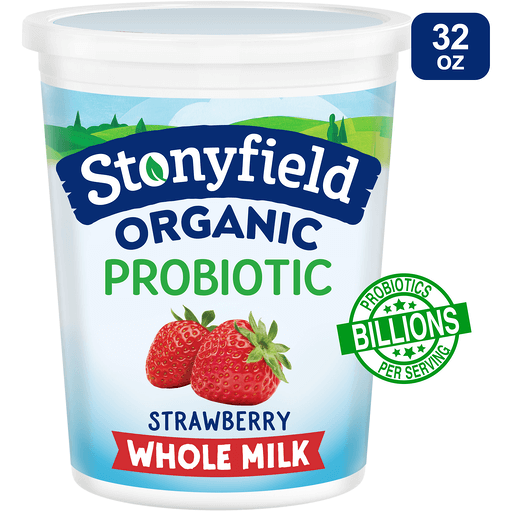 Having the right balance of bacteria in your gut is vital to maintaining good health, and Stonyfield Organic is making it easier and more delicious to up your probiotic intake. Treat your family to a whole milk yogurt with billions of probiotics in each serving with Stonyfield Organic Strawberry Whole Milk Probiotic Yogurt. Our yogurt is the perfect breakfast staple or afternoon snack for you and your little ones and helps support immunity and digestive health when eaten regularly as part of a healthy lifestyle and diet. With five servings per container, our 32-ounce tub of strawberry-flavored yogurt is ideal for families. Plus, our yogurt is also a great substitute for ingredients like sour cream, oil and butter in your favorite recipes for dressings, desserts, baked goods, creamy soups and more. We want our products to be good for you, good for the planet and good for your taste buds. Our yogurt is made without the use of toxic persistent pesticides, antibiotics, artificial growth hormones or genetically modified organisms (GMOs), protecting you for the long haul and contributing to a healthy and sustainable world. Additionally, our yogurt is gluten-free and kosher. Stonyfield Organic has organic options for everyone in your family — babies, kids and adults. Try our yogurt cups and pouches, dairy-free blend pouches, drinkable yogurt, yogurt tubes and more.