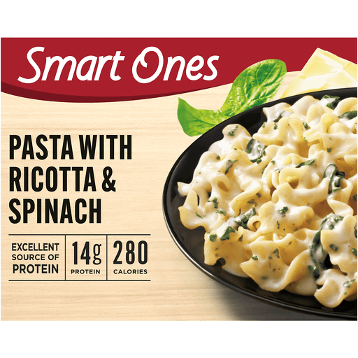 The easy way to make deliciously smart choices. When it's time to think about lunch or dinner, Smart Ones Pasta with Ricotta & Spinach offers a quick meal solution. Our classic Italian style food features mini pasta ribbons in a creamy white sauce with ricotta cheese and spinach. Each dish contains 280 calories, 14 grams of protein and 8 WW Points® per serving. Our pasta dish is an excellent source of protein. Ideal for an easy dinnertime solution, our convenient dish includes a microwave tray for effortless preparation. Cook as directed. Keep our frozen food in the freezer until ready to prepare and cook thoroughly.