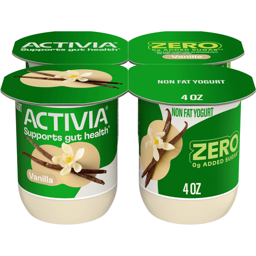 Start your day with your gut health in mind with Activia ZERO 0g Added Sugar* Vanilla Probiotic Nonfat Yogurt. Backed by 20 years of gut health research, this delicious vanilla flavored yogurt contains billions of probiotics and 0 grams of added sugar.* Probiotics are living microorganisms that provide specific health benefits, including supporting gut health.*** Each vanilla flavored yogurt cup has 0 grams of fat, and 50 calories per serving. Enjoy these 0g added sugar* yogurt cups as part of your breakfast, grab and go snacks, or as an addition to your yogurt smoothie. ***Enjoying Activia twice a day for two weeks as part of a balanced diet and healthy lifestyle may help reduce the frequency of minor digestive discomfort, which includes gas, bloating, rumbling, and abdominal discomfort.