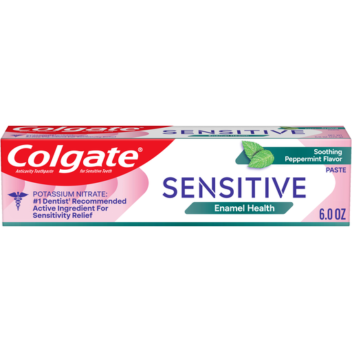 Sensitivity relief never tasted so good with Colgate Sensitive Enamel Health Enamel Repair Toothpaste. This Soothing Peppermint flavored fluoride toothpaste for sensitive teeth offers 24/7 sensitivity relief*, repairs weakened enamel, and shields against erosion. This Colgate sensitive toothpaste contains potassium nitrate, a dentist recommended active ingredient for sensitivity relief. Potassium nitrate is clinically proven to offer long-term sensitivity protection.* Colgate Sensitive Enamel Health Peppermint Toothpaste is designed for daily use and offers sensitivity relief in a flavor you’ll love. Because it’s formulated with 5% potassium nitrate, this sensitive toothpaste offers sensitivity relief that works so you can enjoy cold, hot, and sweet food and drinks. In addition to offering lasting sensitivity relief, this potassium nitrate toothpaste helps repair and protect teeth against the effects of acid erosion and helps prevent tartar buildup**. Help prevent bad breath, cavities, and tartar buildup** while repairing weakened enamel and shielding against erosion with Colgate Sensitive Enamel Health Toothpaste for Sensitive Teeth.