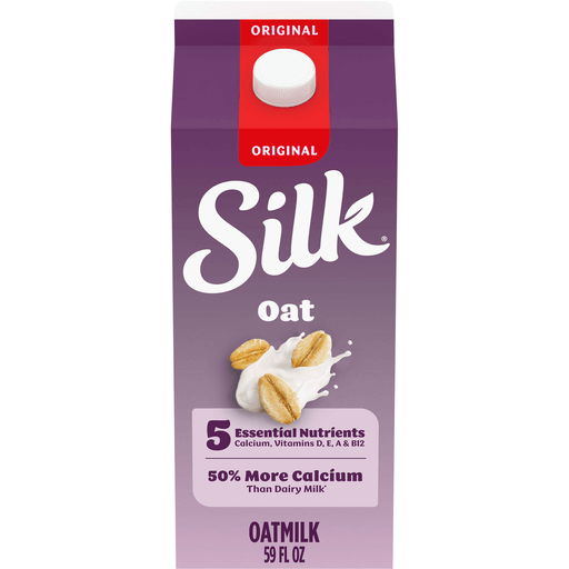 Treat yourself to this deliciously creamy Silk Original Oatmilk. Made with oats grown by Mother Nature, this lactose free milk is perfectly rich, thick, and creamy. Enjoy all of the taste with 0 grams of saturated fat per serving*. Plus, it's an extraordinary tasting plant based milk that you can use throughout your day. It tastes great poured in a bowl of tasty cereal or your favorite cold brew. Plus it’s perfect for frothing for a creamy hot latte. Every serving of this non dairy milk is an excellent source of Vitamins A and D with Vitamins B2 and B12 to help your body turn food into energy. Silk Oatmilk contains 50% more calcium than dairy milk** and is totally free of dairy, gluten, carrageenan, cholesterol and soy. Looking for lactose free cooking or baking supplies? Whether you’re making a bowl of tasty cereal, drinking straight out of a glass or enjoying a frothy coffee, trust Silk — the Original Plant Pioneer. It’s not just oatmilk, it’s Milk of the Land***. Read more about our story on our packaging. Enjoy all of the Silk products, including vegan milk, non dairy creamer and dairy free yogurt varieties. *See Nutrition Facts for sugar and calorie content. **Silk Original Oatmilk: 470mg of calcium per cup; reduced fat dairy milk: 309mg of calcium per cup. USDA National Nutrient Database for Standard Reference, 2022. Data consistent with typical reduced fat dairy milk. ***From plants, not cows. Not nutritionally equivalent to dairy milk.