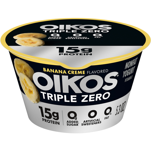 Enjoy epic tastes with Oikos Triple Zero Nonfat Banana Creme Greek Yogurt, the delicious nonfat Greek yogurt cup with more of what you want and less of what you don’t. Each Oikos Triple Zero yogurt cup contains 0% fat, 0g added sugar* per 5.3 oz serving and 0 artificial sweeteners. Our banana creme flavored Greek yogurt packs a punch with 15 grams of protein, so you can always have dependable, high protein snacks with zero holding you back. Because when you feel strong, you are unstoppable. With protein and deliciousness, this Greek nonfat yogurt can help you strive to reach your potential with every serving. Protein is important - an essential nutrient that we need in our diet - and Oikos Triple Zero cups are great tasting, convenient solutions for adding complete protein every day. Pack a Greek nonfat yogurt cup for days that start at a sprint and enjoy a delicious boost of protein at lunch. Or throw in your favorite fruit or toppings for an extra refreshing snack. For even more reasons to go Greek, try Oikos Pro snack cups with 20g of protein per serving or Oikos Blended with chunks of real fruit. Oikos Greek yogurt — Stronger Makes Everything Better (R). *Not a low-calorie food.