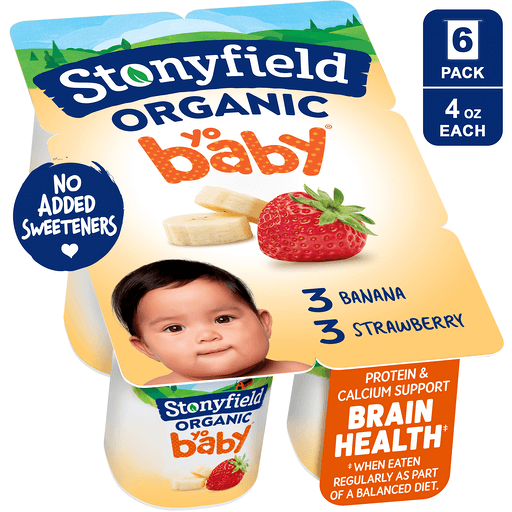 Eating is a lifelong adventure — start your baby's journey on the right foot with Stonyfield Organic YoBaby Yogurt. We know it can be challenging to find food you feel good about giving to your baby, so we created YoBaby yogurt with parents in mind. Banana & Strawberry yogurt cups are great for your baby's first foods and are the perfect size for introducing new flavors. Whole milk yogurt makes a yummy baby food or on-the-go snack to pack in your diaper bag. Our 4 oz yogurt cups help nourish your baby with protein, vitamin D and calcium. The protein and calcium in Stonyfield Organic Yobaby cups also help support brain health when consumed as part of a balanced diet. Like all Stonyfield yogurts, YoBaby baby yogurt cups are certified USDA Organic, so they're made without the use of toxic persistent pesticides, antibiotics, artificial growth hormones or genetically modified organisms (GMOs) — things you don't want to worry about, especially in a baby food. We want our products to be good for you, good for the planet and good for your taste buds. Stonyfield Organic has organic options for everyone in your family — babies, kids and adults. Try our yogurt cups and pouches, dairy-free blend pouches, drinkable yogurt, yogurt tubes and more.