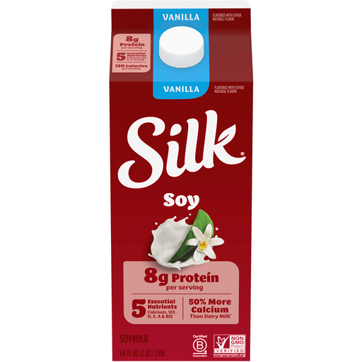 Treat yourself with Silk Vanilla Soymilk**. Made with whole harvested soybeans grown by Mother Nature, this lactose free milk is the Original Nutrition Powerhouse. It's an extraordinary tasting plant based milk that you can use throughout your day. Every serving of this nondairy milk has 50% more calcium than dairy milk*, along with 6 grams of complete plant-based protein (12% DV). Silk Soymilk is totally free of dairy, gluten, carrageenan, cholesterol, artificial colors and artificial flavors. Looking for lactose free cooking or baking supplies? Whether you’re making a healthy smoothie, making a bowl of tasty cereal or drinking straight out of a glass, trust Silk — the Original Plant Pioneer. Read more about our story on our packaging. Enjoy all of the Silk products, including vegan milk, non dairy creamer and dairy free yogurt varieties. *Silk Vanilla Soymilk: 470mg calcium per cup; reduced fat dairy milk: 309mg calcium per cup. USDA, ARS. FoodData Central, 2022. **Flavored with other natural flavors.