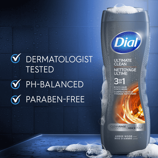 Rinse clean and feel fresh all day with Dial Ultimate Clean 3-in-1 body, hair and face wash in an amber wood scent. The convenience of shampoo, body and face wash in one handy bottle, engineered for an all-in-one solution. Formulated with Dial Clean Rinse Technology, this men's body wash cleanses deep and rinses away with no filmy residue. It's developed with patented technology to keep you feeling and smelling fresh all day. Dial men's body washes are free from parabens, phthalates and silicones & leave skin looking and feeling hydrated and refreshed. With a 100% recyclable bottle you can feel good about, try Dial Ultimate Clean Men's 3-in-1 body wash for a no-nonsense clean. This package contains 16 fluid ounces of Dial Men's Ultimate Clean 3-in-1 body, hair and face wash.