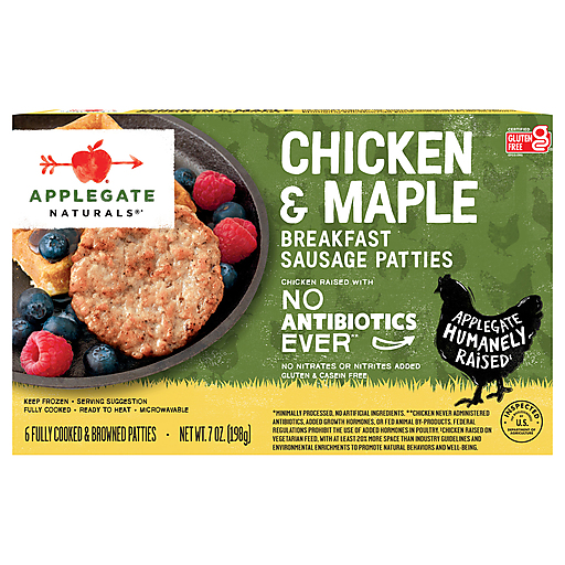 Instantly satisfy your pancake craving with Applegate Natural Chicken & Maple Breakfast Sausage Patties. These frozen sausage patties are pre-cooked and ready to heat for a breakfast you'll never forget. Microwaveable. We source from farms where animals are raised with care and respect. We believe this leads to great tasting products and peace of mind-- all part of our mission. Changing The Meat We Eat. Certified Gluten Free. Fully Cooked. Ready to Heat. Microwavable.