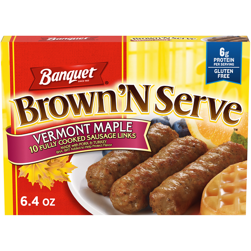 7 g protein per serving. Per 3 Links: 180 calories; 5 g sat. fat (25% DV); 430 mg sodium (19% DV); 1 g total sugars. Gluten free. Since 1953. 10 fully cooked sausage links. Made with pork & turkey. BHA, BHT, citric acid added to help protect flavor. Microwaveable. Banquet Brown 'N Serve maple links are the quick, easy and convenient way to enjoy sausage. Already precooked, Banquet Brown 'N Serve maple links deliver that fresh, out of the pan taste in just minutes. These maple links are made with real maple sugar to bring out that homestyle flavor. It’s the perfect addition for a wide variety of breakfast foods! U.S. Inspected and passed by Department of Agriculture. www.banquet.com. how2recycle.info. SmartLabel: Scan for more food information. Questions or comments, visit us at www.banquet.com or call Mon.-Fri., 1-800-257-5191 (except national holidays). Please have entire package available when you call so we may gather information off the package. Made in the USA.