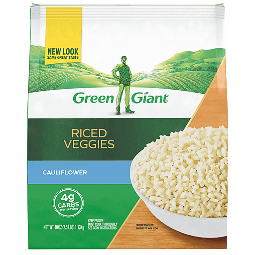 Green Giant Riced Veggies Cauliflower has the feel of one of your favorite side dishes, but with a frozen veggie, cauliflower twist. Made with 100% vegetables, these riced vegetables are a delicious dinnertime side dish and a unique alternative to white rice. These Green Giant frozen vegetables come without sauce or seasoning so you can prepare them how you want or pair them with a variety of entrees. These frozen Riced Veggies have 4 grams of carbs per serving(1) and are gluten free. Serve these riced veggies as an alternative to rice, potatoes and pasta at any lunch or dinner. To prepare this riced cauliflower, simply follow the cooking instructions and heat in the microwave or on the stovetop. Keep Green Giant frozen riced cauliflower in the freezer until you are ready to prepare and serve.