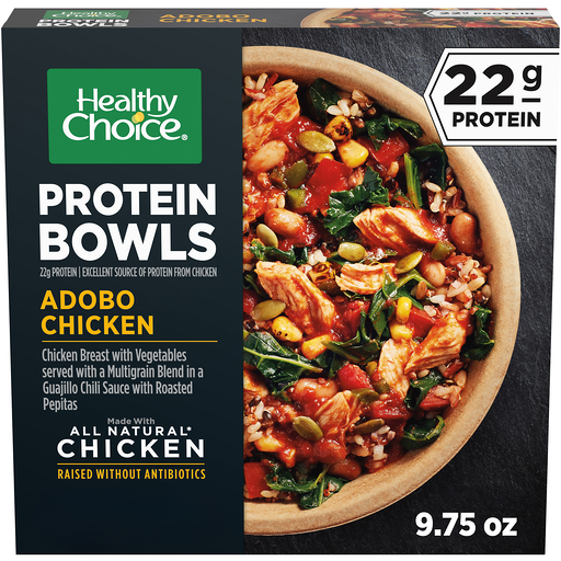 Boost your day with Healthy Choice Protein Bowls Adobo Chicken. Each Healthy Choice frozen entree is a delicious way to get a reliable source of fiber and protein to help you power through your day. This high-protein frozen meal features all-natural¹ chicken (raised without antibiotics) and mixed vegetables, including fire-roasted corn, tomatoes, and poblano peppers, served with a multigrain blend in a spicy guajillo chili sauce, perfect for a nourishing meal to fuel your body. A delicious way to keep you feeling satisfied, this power bowl frozen meal provides 32% of your daily protein with 22 grams per serving and 25% of your daily dietary fiber with 7 grams per serving and is perfect for a satisfying lunch or quick dinner. Simply microwave this frozen chicken bowl for 4 to 5 minutes and let stand for 1 minute. Keep in the freezer until ready to enjoy. ¹No artificial ingredients. Minimally processed.