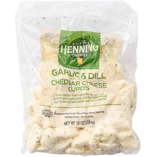 Hennings Garlic & Dill Cheese Curds 10 OzWisconsin cheese. Made by the Henning family since 1914 in Kiel, Wisconsin. Crafted by Master Cheesemaker - Kerry Henning.