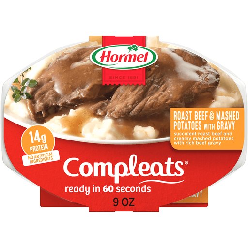 Hormel Roast Beef & Gravy, With Mashed Potatoes 9 OzSucculent roast beef and creamy mashed potatoes with rich beef gravy. Since 1891. US inspected and passed by Department of Agriculture. 14 g protein. Fast Facts: 14 g protein. hormel.com.