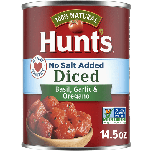 Get cooking with Hunt's Diced Tomatoes with Basil, Garlic and Oregano No Salt Added. Perfect in chili and soups, these diced tomatoes are a crowd-pleaser and pantry staple. From soups and appetizers to sides and sauces, these canned tomatoes are a flavorful addition to any recipe. Hunt's tomatoes are the trusted start to easy and delicious meals. These 100% natural canned diced tomatoes are Non-GMO Project Verified and contain no artificial preservatives or ingredients, so you can trust they are an ideal way to elevate meals for your family. Try these canned tomatoes in chili, tomato soup, on toasted bread or in homemade pasta sauce. Ready when you need it, juicy diced tomatoes canned to ensure peak flavor. Keep them on hand for canned goods with delicious flavor. Great meals start with Hunt’s.
