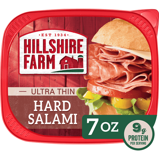 Bring the goodness of the farm to the table and experience the taste of a homestyle sandwich made with Hillshire Farm Ultra Thin Sliced Hard Salami Sandwich Meat. Made with perfectly seasoned, uncured beef and pork, this hard salami is juicy and flavorful. Farmhouse quality hard salami is made with no artificial preservatives or flavors, and no nitrates or nitrites added (except for those naturally occurring in the celery juice powder and sea salt). Try sliced hard salami in a sandwich or wrap, on a salad, or as part of a charcuterie board. Each 7-ounce package of Hillshire Farm Hard Salami is double sealed for freshness and flavor. At Hillshire Farm brand, there is a commitment to the values of the farm, knowing that quality is always the most important ingredient. Taste the generations of care and craftsmanship in every recipe because farmhouse values never go out of season.