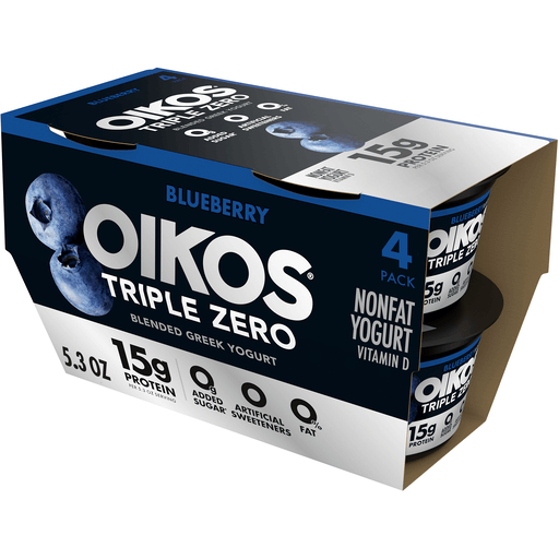 Enjoy epic tastes with Oikos Triple Zero Nonfat Blueberry Greek Yogurt Pack, four delicious nonfat Greek yogurt cups with more of what you want and less of what you don’t. Each Oikos Triple Zero yogurt cup contains 0% fat, 0g added sugar* per 5.3 oz serving and 0 artificial sweeteners. Our blueberry flavored Greek yogurt packs a punch with 15 grams of protein per serving, so you can always have dependable, high protein snacks with zero holding you back. Because when you feel strong, you are unstoppable. With protein and deliciousness, this Greek sugar free nonfat yogurt can help you strive to reach your potential with every serving. Protein is important - an essential nutrient that we need in our diet - and Oikos Triple Zero cups are great tasting, convenient solutions for adding complete protein every day. Pack a Greek nonfat yogurt cup for days that start at a sprint and enjoy a delicious boost of protein at lunch. Or throw in your favorite fruit or toppings for an extra refreshing snack. For even more reasons to go Greek, try Oikos Pro snack cups with 20g of protein per serving or Oikos Blended with chunks of real fruit. Oikos Greek yogurt — Stronger Makes Everything Better (R). *Not a low-calorie food.