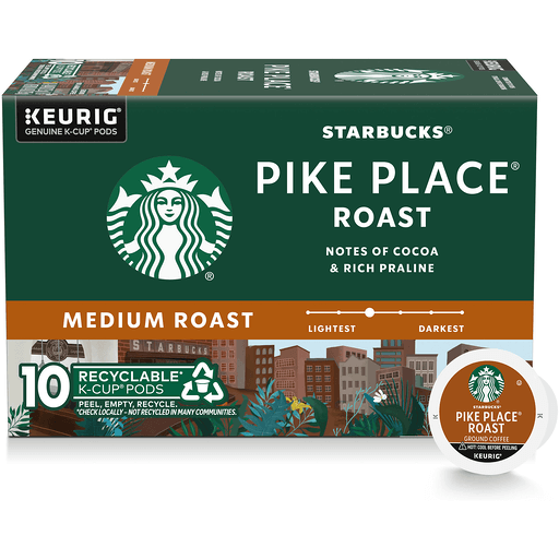 Keurig: Genuine K-Cup pods. The Story of Pike Place Roast: Name for our first store in Seattle's Pike Place Market, this coffee is served fresh every day in Starbucks cafes around the world. A smooth, well-rounded blend of Latin American beans with subtly rich flavors of cocoa and praline, it's the perfect brewed coffee - a consistently delicious cup you can really look forward to. Enjoy the spirit of Pike Place in every sip. Keurig genuine k-cup pods: Only genuine k-cup pods are optimally designed by Keurig for your Keurig coffee maker to deliver the perfect beverage in every cup. Recyclable (Not recycled in all communities) K-Cup pods. Peel, empty, recycle. Peel: Starting at puncture, peel lid and dispose. Empty: Compost or dispose of grounds. (Filter can remain) Recycle: Check locally (Not recycled in all communities) to recycle empty cup. Visit Keurig.com/recyclable to learn more. Committed to 100% Ethical Coffee Sourcing in partnership with Conservation International. Learn more about Starbucks sustainable and ethical sourcing practices athome.starbucks.com/ethical-sourcing. Starbucks Rewards: Join today: starbucks.com/morestars.