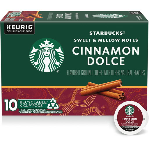 Keurig - Genuine K-Cup Pods. Sweet & mellow notes. The crafting of Cinnamon Dolce flavored coffee. Cinnamon and brown sugar notes are complemented by our lightest roast. Made without artificial flavors, it's a mellow cup with a wonderful softness to sweeten your day. Keurig: Genuine k-cup pods. Only Genuine K-Cup Pods are optimally designed by Keurig for your Keurig coffee maker to deliver the perfect beverage in every cup. Recyclable (Not recycled in all communities) K-Cup pods. Peel; empty; recycle. Caution: Pod is hot. Allow to cool after use. Peel: Starting at puncture, peel lid and dispose. Empty: Compost or dispose of grounds. (Filter can remain). Recycle: Check locally (Not recycled in all communities) to recycle empty cup. Visit Keurig.com/recyclable to learn more. Committed to 100% Ethical Coffee Sourcing in partnership with Conservation International. Learn more about Starbucks sustainable and ethical sourcing practices athome.starbucks.com/ethical-sourcing. Starbucks Rewards: Join today: starbucks.com/morestars.