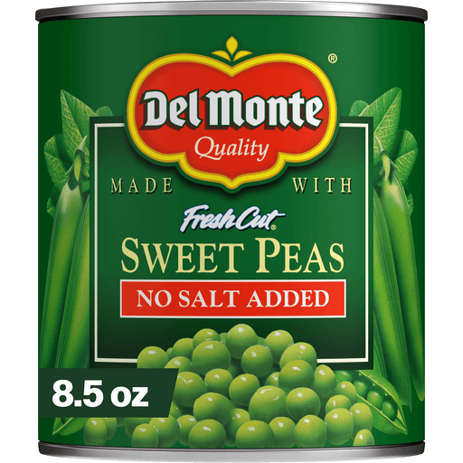 Del Monte Fresh Cut No Salt Added Sweet Peas are the perfect addition to any pantry. The 8.5 oz. cans are perfect for smaller meals and help prevent waste. Bursting with flavor, our peas are picked at the peak of freshness to ensure a delectable taste in every bite. Made without preservatives, and with no added salt, these non-GMO* canned sweet peas give you the freedom to season them to your liking for the perfect vegetable dish. Packaged in non-BPA** lined cans, you can feel good about serving our canned peas to your loved ones. Whether you enjoy them straight from the can or use them to enhance your favorite soup or pasta recipe, Del Monte Sweet Peas are a versatile and convenient option for any meal. Plus, their compact design allows for easy storage in your pantry, making them the go-to choice for a quick and lightly sweet side dish. Elevate your cooking with the goodness of Del Monte Canned Vegetables - your taste buds will thank you! *No genetically engineered ingredients. **Can lining produced without the intentional addition of BPA.