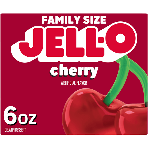 Snack happy. Jell-O Cherry Artificially Flavored Gelatin Dessert Mix lets you add some wonder to your day with a delicious snack. Spoon up a smile with our artificially flavored cherry Jell-O gelatin that contains 90 calories per serving. Our colorful, jiggly treat is perfect for everyday snacking or special occasions with family and friends. Additionally, our gelatin dessert mix is a versatile ingredient for creating desserts like poke cakes, parfaits, pretzel salads, rainbow layer cakes and more. Our artificially flavored cherry gelatin dessert is easy to prepare. Simply add 2 cups boiling water to the gelatin mix, stir for 2 minutes until completely dissolved, stir in 2 cups cold water, then refrigerate for 4 hours or until firm. Each family size Jell-O gelatin dessert mix is individually packaged in a 6-ounce sealed pouch and makes 8, 1/2-cup servings.