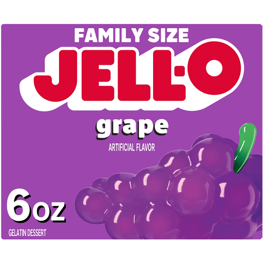 Snack happy. Jell-O Grape Artificially Flavored Gelatin Dessert Mix lets you add some wonder to your day with a delicious snack. Spoon up a smile with our artificially flavored grape Jell-O gelatin that contains 90 calories per serving. Our colorful, jiggly treat is perfect for everyday snacking or special occasions with family and friends. Additionally, our gelatin dessert mix is a versatile ingredient for creating desserts like poke cakes, parfaits, pretzel salads, rainbow layer cakes and more. Our artificially flavored grape gelatin dessert is easy to prepare. Simply add 2 cups boiling water to the gelatin mix, stir for 2 minutes until completely dissolved, stir in 2 cups cold water, then refrigerate for 4 hours or until firm. Each family size Jell-O gelatin dessert mix is individually packaged in a 6-ounce sealed pouch and makes 8, 1/2-cup servings.