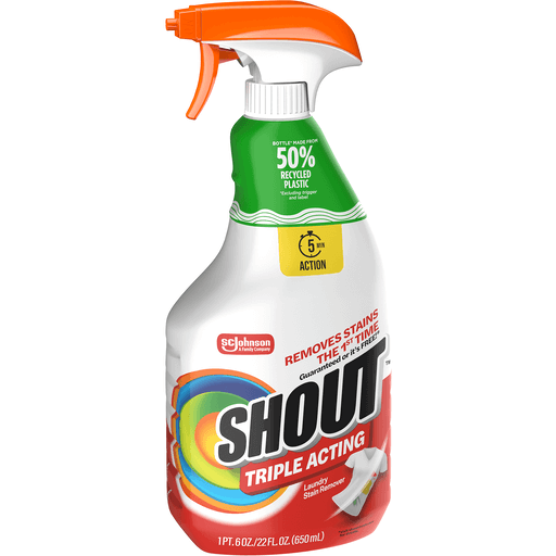 Shout Triple-Acting Laundry Stain Remover is tough on stains, but gentle on your color-fast machine-washable fabrics. It’s triple-acting formula Clings onto fabric stains in the washing cycle, Penetrates stains quickly once sprayed upon, and Lifts stains off of fabric. Shout Triple-Acting is 50x more concentrated than in-wash powder* and works on a wide range of everyday stains like food, grass, dirt, and blood. Safe for all colorfast washables and works in all water temperatures. Shout has the stain-fighting ingredients to break up and remove tough stains so you can live in the moment, and clean up later.