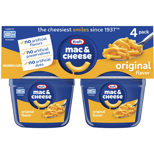 Help yourself to a cup of comfort. Kraft Original Mac and Cheese Dinner Cups are easy and ready in just minutes. Kids and adults love the rich taste and creamy texture of macaroni pasta with cheesy goodness. Easy mac and cheese cups include macaroni pasta and original flavor cheese sauce mix so you have everything you need to make delicious quick mac and cheese by just adding water. With no artificial flavors, preservatives or dyes, our microwavable macaroni and cheese cups make a perfect snack or a classic meal side. Preparing our microwavable cups is a breeze. Just combine the pasta with water up to the fill line in the cup, microwave for 3.5 minutes and stir in the cheese sauce mix. Each sleeve includes four 2.05 ounce cups. Kraft Mac & Cheese inspires the positive power of comfort.