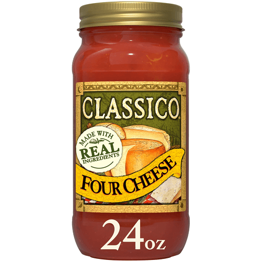More cheese, more mmm's and ahh's around the table. Classico Four Cheese Pasta Sauce is easy to prepare and offers a rich, flavorful taste. Made with real ingredients, our sauce features a rich blend of ricotta, Provolone, aged Parmesan and Romano cheese. Simply simmer and serve our sauce with your favorite dish. Use our pasta sauce in a classic spaghetti and meatballs dish or a pasta casserole, on your homemade pizza, or as a dipping sauce for garlic bread. Be sure to refrigerate our 24-ounce jar of sauce after opening. Classico pasta sauce has a flavor for everyone in your family, from Four Cheese Pasta Sauce to Tomato & Basil Pasta Sauce. Make it yours, for your homemade dish.