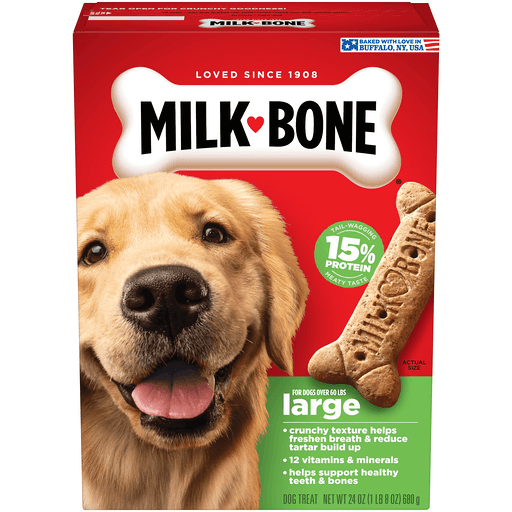 Give your dog tasty fun every day with Milk-Bone Original Dog Biscuits. These large dog treats deliver that irresistible, classic crunch and tail-wagging meaty taste dogs can’t get enough of in every bite. But the great taste isn’t the only thing to love about these dog snacks. Their crunchy texture helps clean teeth and reduce tartar build-up to make those sloppy doggy kisses even more enjoyable. Plus, they’re made with more than 12 vitamins and minerals, and they’re produced in Buffalo, New York, USA. Add a box to your cart, and fill every day of doglife with more love (and deliciousness).