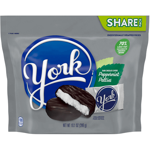 Chill out with YORK dark chocolate covered peppermint patties candy with 70 percent less fat than other leading chocolate candy brands! These small but mighty candies invigorate your taste buds with a minty kick, combined with rich dark chocolate candy to keep you feeling excited for a full day ahead. Bring a bag into work so that everyone can have a piece. This bag is perfect for any special occasion like movie marathons, birthday parties, work celebrations and family get-togethers. Everyone can reach in and grab YORK peppermint patties treats of their own with this share pack. These dark chocolate peppermint treats are also fun to bake with! Wrap your favorite cookie dough around the mint chocolate candy, bake in the oven, then experience a minty fresh cookie created by yours truly. You can also hand out scrumptious YORK dark chocolate peppermint patties candies during the holidays. Pack Easter eggs and baskets, stuff Christmas stockings, fill Halloween candy bowls and Valentine's Day gift bags with a minty-fresh treat everyone is sure to love. Even better, these minty delights covered in dark chocolate are gluten free and kosher certified, making them perfect for sharing with those who love a refreshing but rich snack.