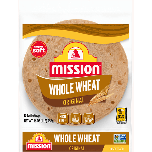 In addition to their great taste and soft texture, Mission Soft Taco Whole Wheat Tortillas deliver all of the extra benefits of whole grains. Our tortillas are made with 100% whole wheat, so they're naturally satisfying, a great source of whole grains, and high in fiber. And since our tortillas are also free of trans fat and cholesterol, they're a smart addition to any meal. Our whole wheat tortillas are versatile enough for any recipe you can imagine, but we love serving them with ancho chicken and avocado for a delicious twist on taco night. Includes one 10-count package of Mission Soft Taco Whole Wheat Tortillas.