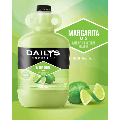 Gluten free. Contains real fruit juice. Personalize your margaritas, and more with the great taste of Daily's margarita mix made with real lime juice from the freshest limes and non-alcoholic triple sec. Daily's makes perfectly delicious cocktails every time. Non-alcoholic. www.dailyscocktails.com. For more recipes, tips, andfun ideas, Visit www.dailyscocktails.com.