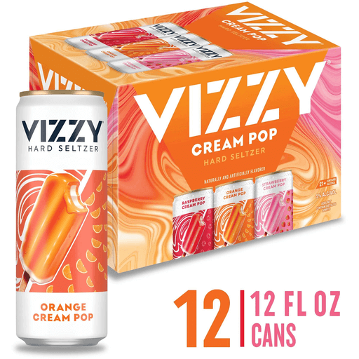 Kick the fun up a notch with these refreshing spiked seltzers inspired by your favorite frozen treats! The Vizzy Cream Pop Hard Seltzer Variety Pack features vibrant dual flavors with 5.0% ABV. Three nostalgic blends are included: 6 cans of Orange Cream Pop, 3 cans of Raspberry Cream Pop and 3 cans of Strawberry Cream Pop. Leading with a refreshing orange, raspberry or strawberry flavor balanced with a creamy vanilla finish, these gluten free hard seltzers contain less than 1 gram of sugar and 100 calories. Enjoy these slightly sweet flavored malt beverages with salty snacks for a nice contrast to the creamy fruit flavors. They pair perfectly with all your favorite outdoor activities like pickleball, golf and beach days, or with more laid back activities like getting together with friends, family barbecues or anytime you feel like savoring a crisp, refreshing spin on a classic favorite. Pick up a 12 pack of 12.0 fl oz cans today, and enjoy these delicious Vizzy flavors that are bursting with refreshment.
