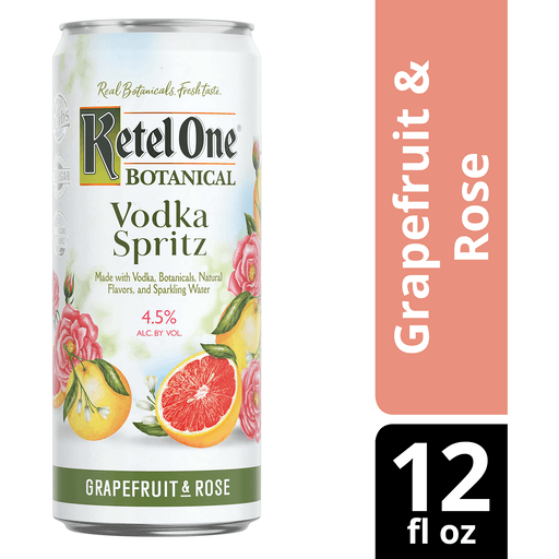 Artfully infused with real botanicals, natural fruit essence and sparkling water, Ketel One Botanical Vodka Spritz Grapefruit & Rose offers an enticing new way to enjoy vodka. Made with exceptionally smooth, Non-GMO Ketel One Vodka and stored in a slim ready-to-enjoy can, this drink features the zesty taste of freshly squeezed grapefruit with a touch of rose. Ketel One Botanical Vodka Spritz Grapefruit & Rose is gluten-free and contains no artificial sweeteners, added sugars or artificial colors. For a delicious drink, simply serve in a wine glass over ice and garnish with a slice of grapefruit. Includes one 3.6% alc./vol. 12 fl oz can of Ketel One Botanical Vodka Spritz Grapefruit & Rose. Please drink responsibly.