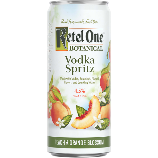 Artfully infused with real botanicals, natural fruit essence and sparkling water, Ketel One Botanical Vodka Spritz Peach & Orange Blossom offers an enticing new way to enjoy vodka. Made with exceptionally smooth, Non-GMO Ketel One Vodka and stored in a slim ready-to-enjoy can, this drink features the fresh taste of ripe peaches with a subtle orange blossom finish. Ketel One Botanical Vodka Spritz Peach & Orange Blossom is gluten-free and contains no artificial sweeteners, added sugars or artificial colors. For a delicious drink, simply serve in a wine glass over ice and garnish with a slice of peach. Includes one 3.6% abc./vol. 12 fl oz can of Ketel One Botanical Vodka Spritz Peach & Orange Blossom. Please drink responsibly.
