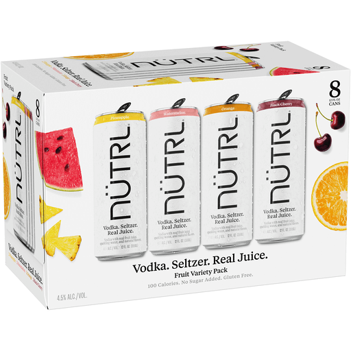NUTRL Real Fruit Juice Vodka Seltzer is an easy-to-drink hard seltzer that combines vodka with a deliciously fruity twist. This spiked seltzer variety pack includes flavored hard seltzers of watermelon seltzer, orange seltzer, black cherry seltzer and pineapple seltzer. These alcoholic beverages are made with refreshingly simple, tasty and uncomplicated ingredients like vodka, seltzer water, and real fruit juice. It's that simple and it's even more refreshing. NUTRL Vodka Seltzer fruit drinks are gluten free with natural flavors, no added sugar, and 100 calories. These gluten free alcohol drinks have a 4.5% ABV and can be enjoyed cold or over ice right out of the can. No matter how you prefer it, these sugar free drinks are down right delicious, and the slim cans of NUTRL seltzer are easy to hold, store and transport wherever the party goes whether you need crisp alcohol beverages or simple zero sugar drinks that can be enjoyed year-round, no matter the season. Real Vodka. Real Juice. Enjoy NUTRL Responsibly.